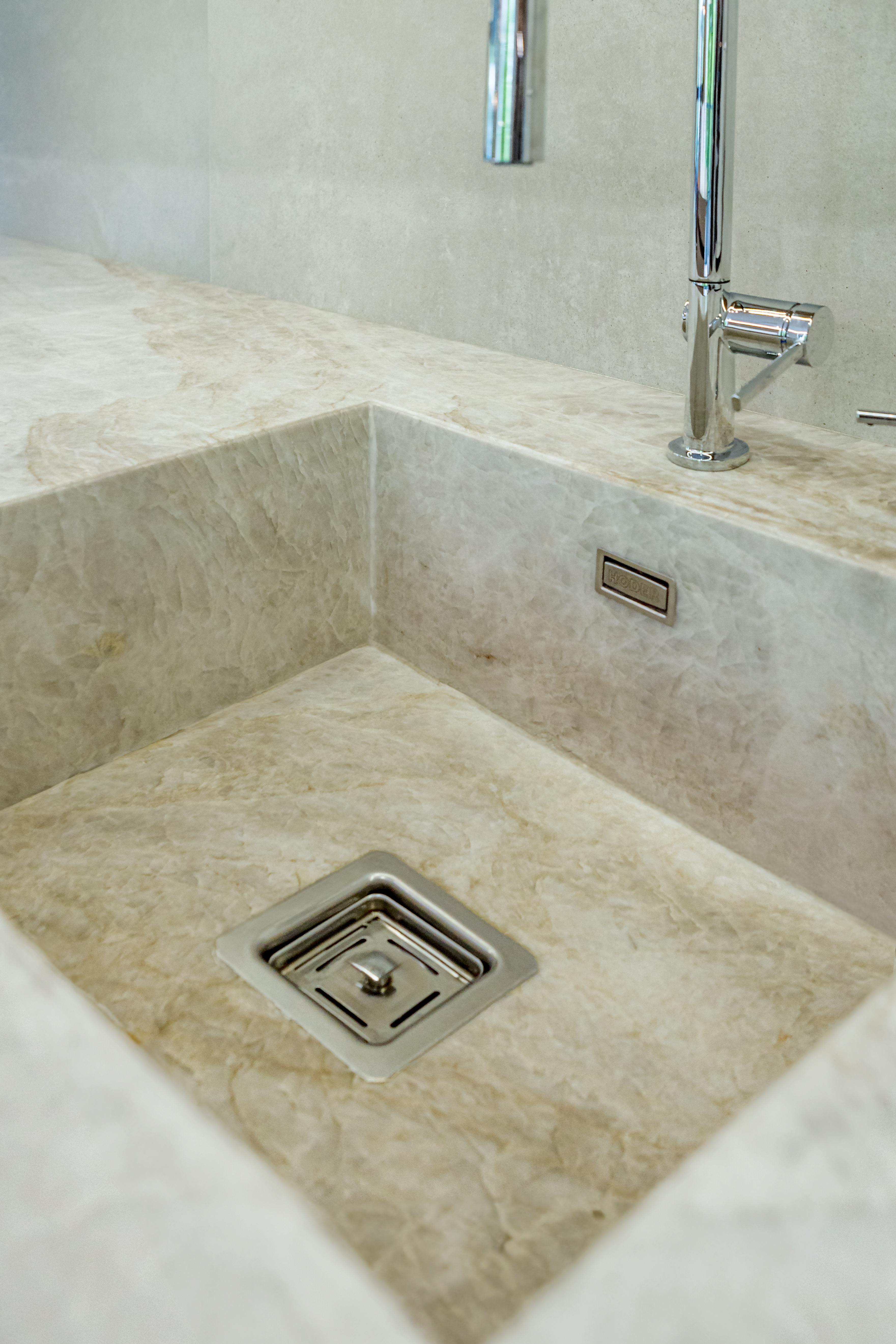 Zacznijmy od jednego z ważniejszych pomieszczeń w domu, gdzie szczególnie istotne jest połączenie estetyki i wygody użytkowania – kuchni! Zlew ukryty w blacie, czyli niewidoczny zlew od HODER, cieszy się ogromną popularnością. Architekci doceniają również blat kamienny ze zintegrowaną misą. To rozwiązanie pozwala płynnie połączyć powierzchnię roboczą ze zlewem, tworząc jednolitą, elegancką strefę. To sprawia, że można optycznie powiększyć blaty kuchenne. Inną ważną kwestią jest to, że minimalna szerokość fug oznacza mniej miejsc, gdzie mogą gromadzić się bakterie i wilgoć. Ponadto, jednolita powierzchnia ułatwia utrzymanie porządku, który przecież w kuchni jest priorytetem!