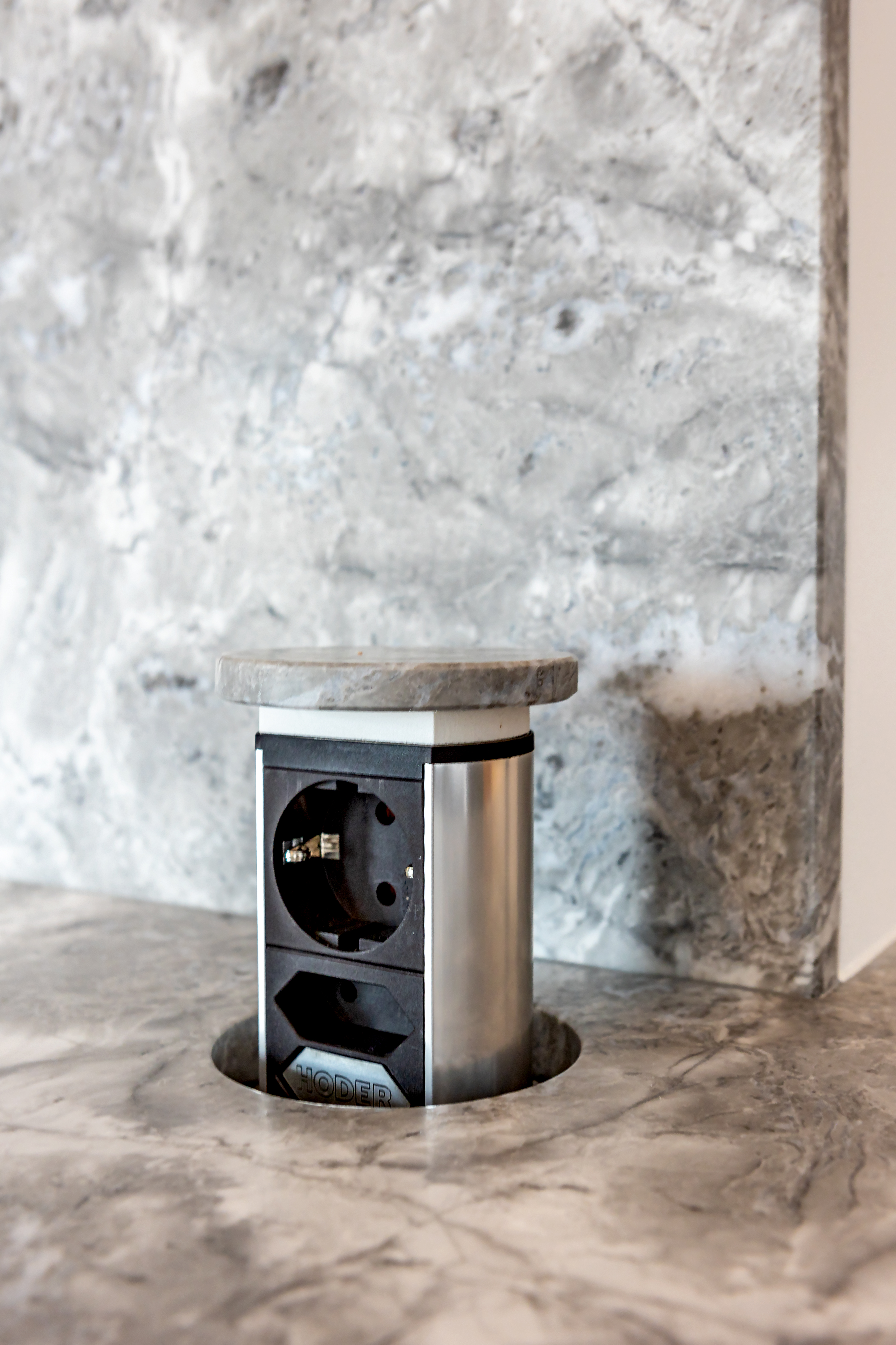 Na koniec przedstawiamy powerport od HODER. To gniazdko pozwala na szybki i łatwy dostęp do energii, bez zaburzania jednolitej powierzchni blatu. Dzięki temu piękno, jakie posiadają blaty granitowe, lub te wykonane z innego kamienia naturalnego, nie jest niczym przyćmione. Jest to również świetne rozwiązanie, które pozwala zaoszczędzić miejsce na ścianie, a także powierzchni roboczej blatu. Tutaj można wybierać między okrągłą a prostokątną wersją elewatora, subtelnie integrującego się z blatem. Powerport szczególnie polecamy dla: