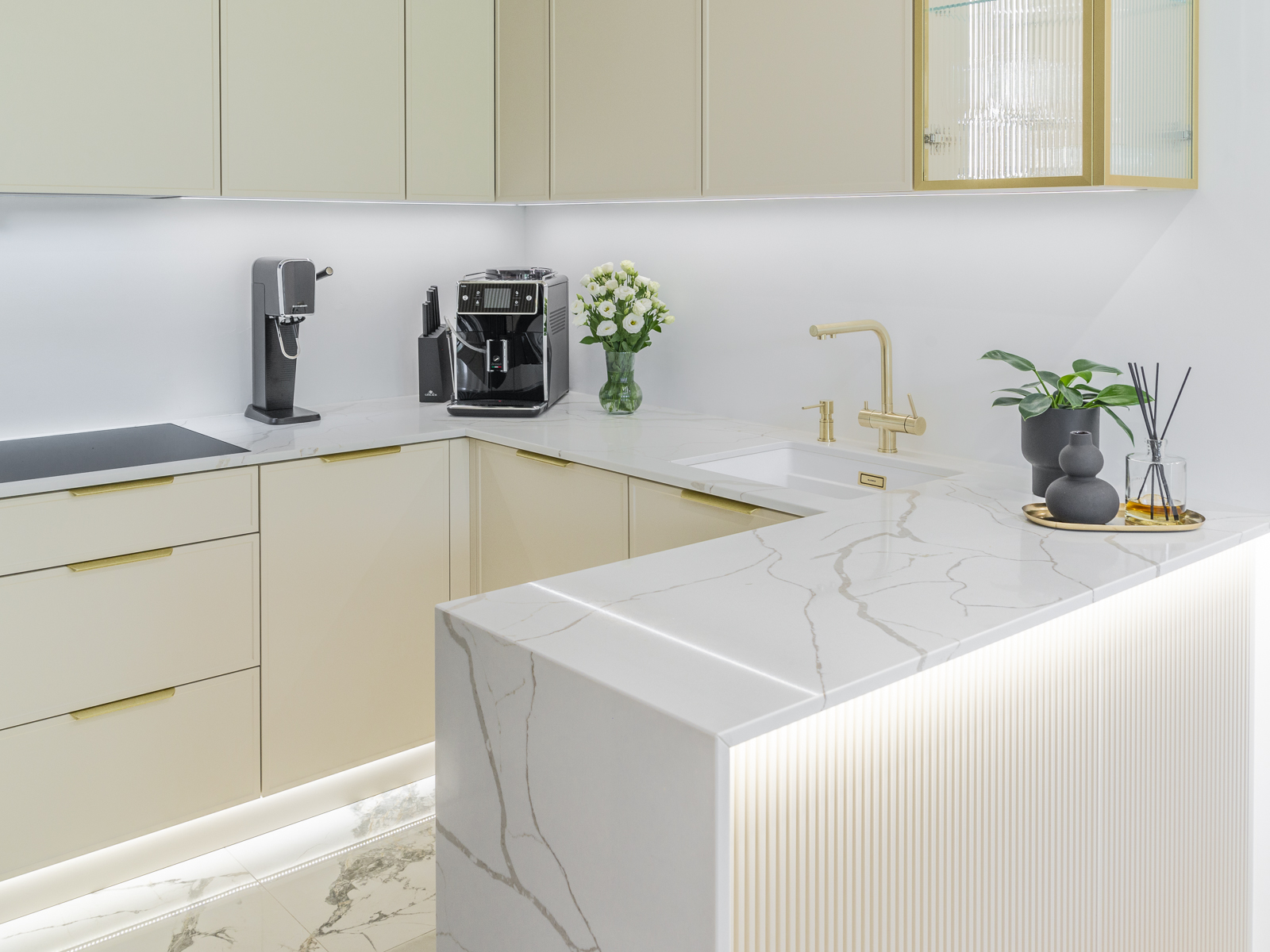Uniwersalność – biały blat kuchenny kamienny daje mnóstwo możliwości aranżacyjnych. Bez względu na to, czy zdecydujesz się na drewniane fronty szafek, czy eleganckie ciemne meble, biały blat zawsze będzie pasować.