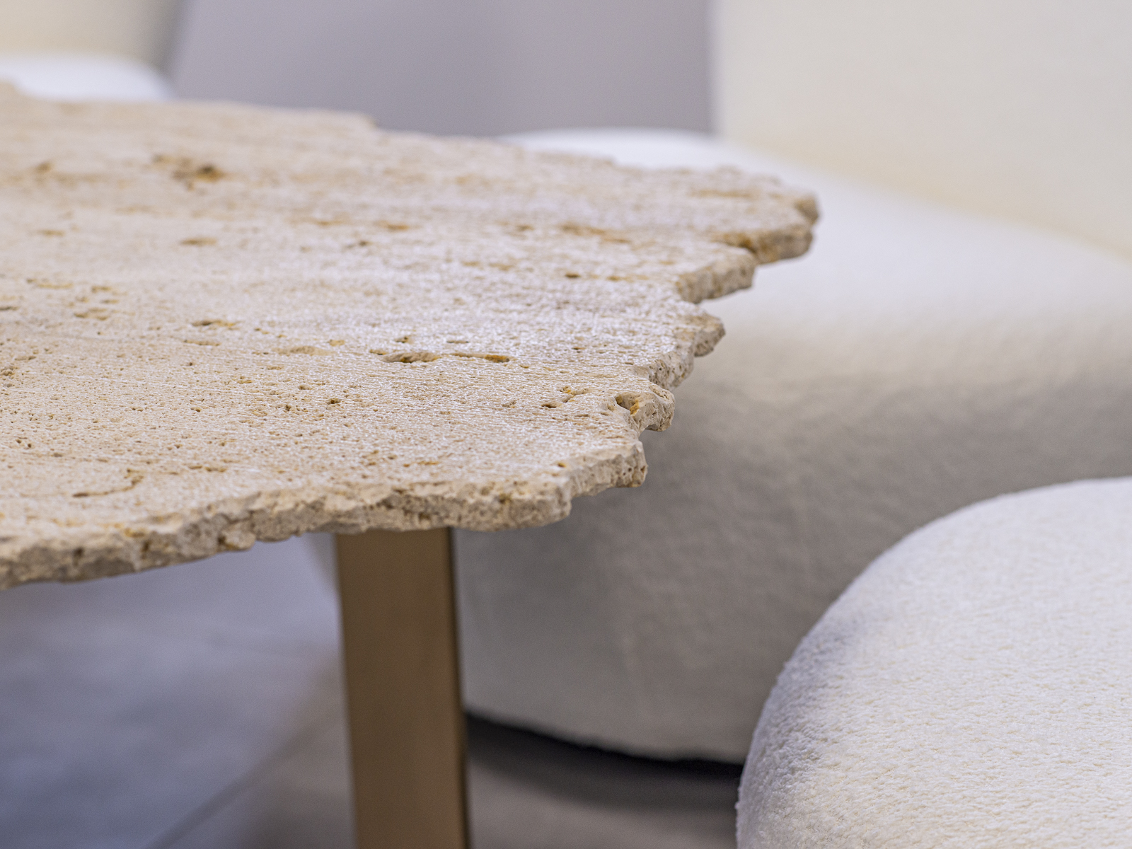 Kiedy klient szuka czegoś bardziej subtelnego, można zaproponować mu trawertyn. Ten kamień naturalny, o delikatniejszej, lekko chropowatej strukturze, wprowadza do wnętrza atmosferę spokoju i naturalności. Z powodzeniem sprawdzi się w minimalistycznych aranżacjach w typie modern classic, gdzie głównym celem jest harmonia, a nie intensywny efekt wizualny.