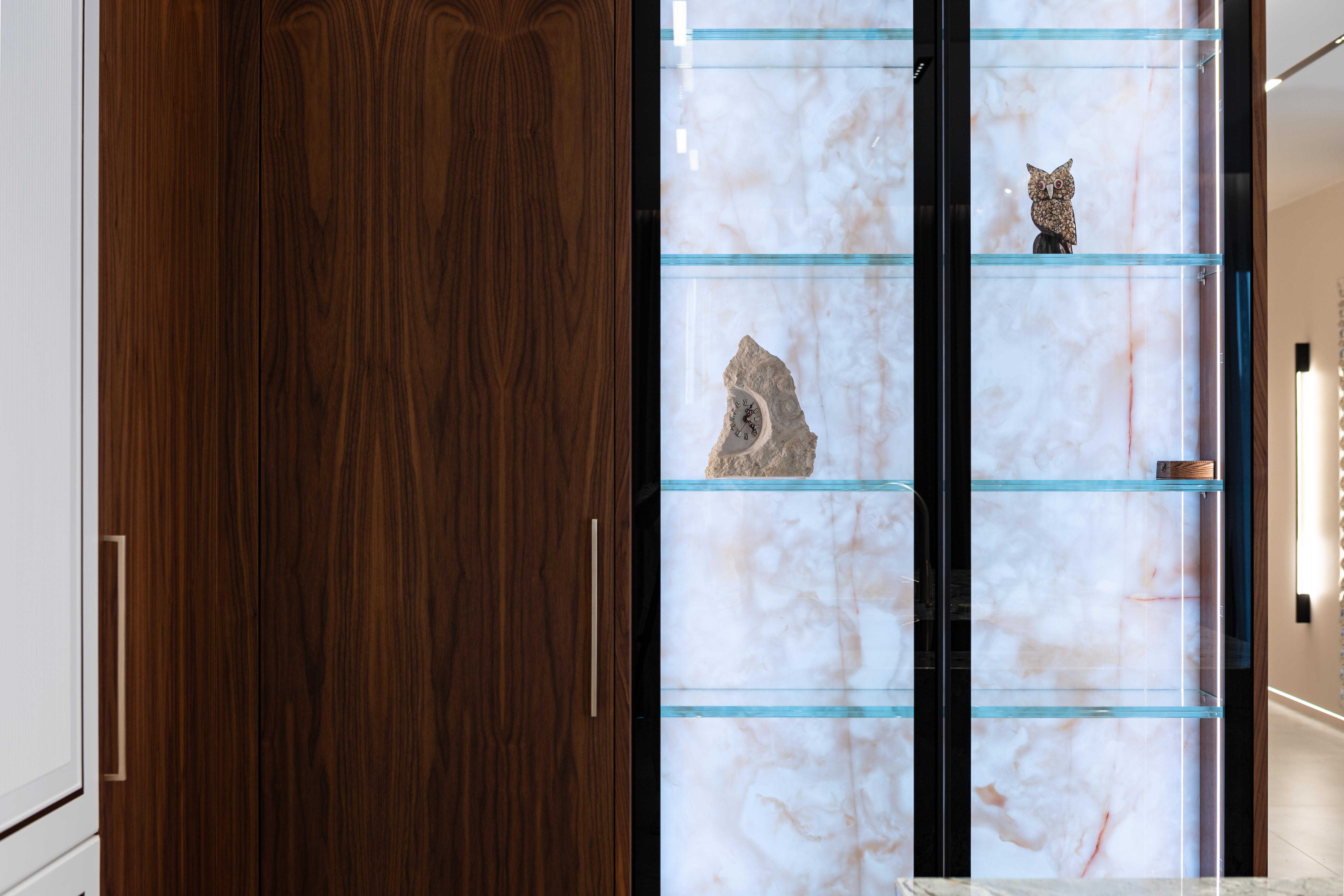 A może interesuje Cię onyks? Kamień ten, dzięki swojej zdolności do przepuszczania światła, może stać się „kropką nad i” projektu. Onyks podświetlany daje niezwykłe efekty wizualne, stając się centralną ozdobą wnętrza. By jednak nie przesadzić, warto używać go z rozwagą, głównie jako element dekoracyjny – na ścianach, ozdobnych panelach czy wyspach kuchennych np. w zestawieniu z twardszym granitem.