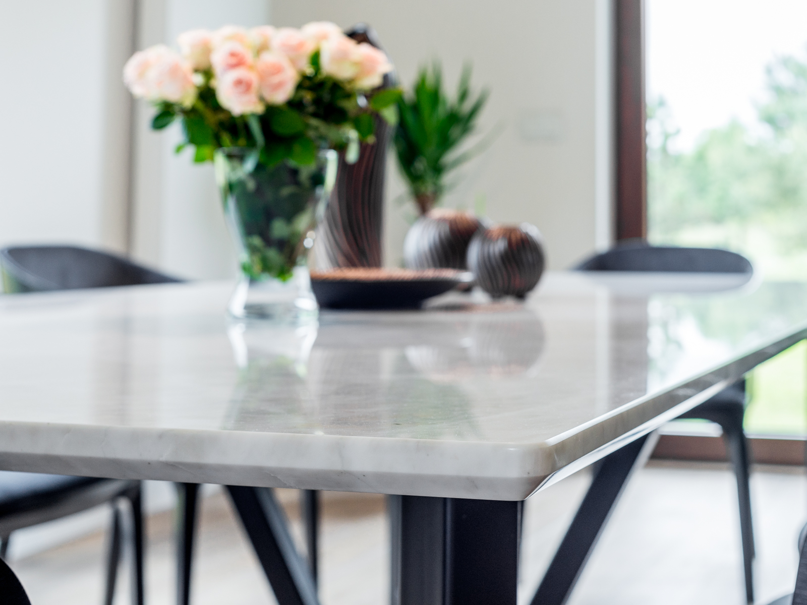 W projektach premium króluje również marmur, który od lat kojarzy się z luksusem i elegancją. Taki stół z kamienia idealnie wpisuje się w estetykę minimalistycznych, ale także klasycznych wnętrz. Odpowiednio zaimpregnowany marmur, a także trawertyn, przetrwa niejedne święta i spotkania rodzinne przy kawie.