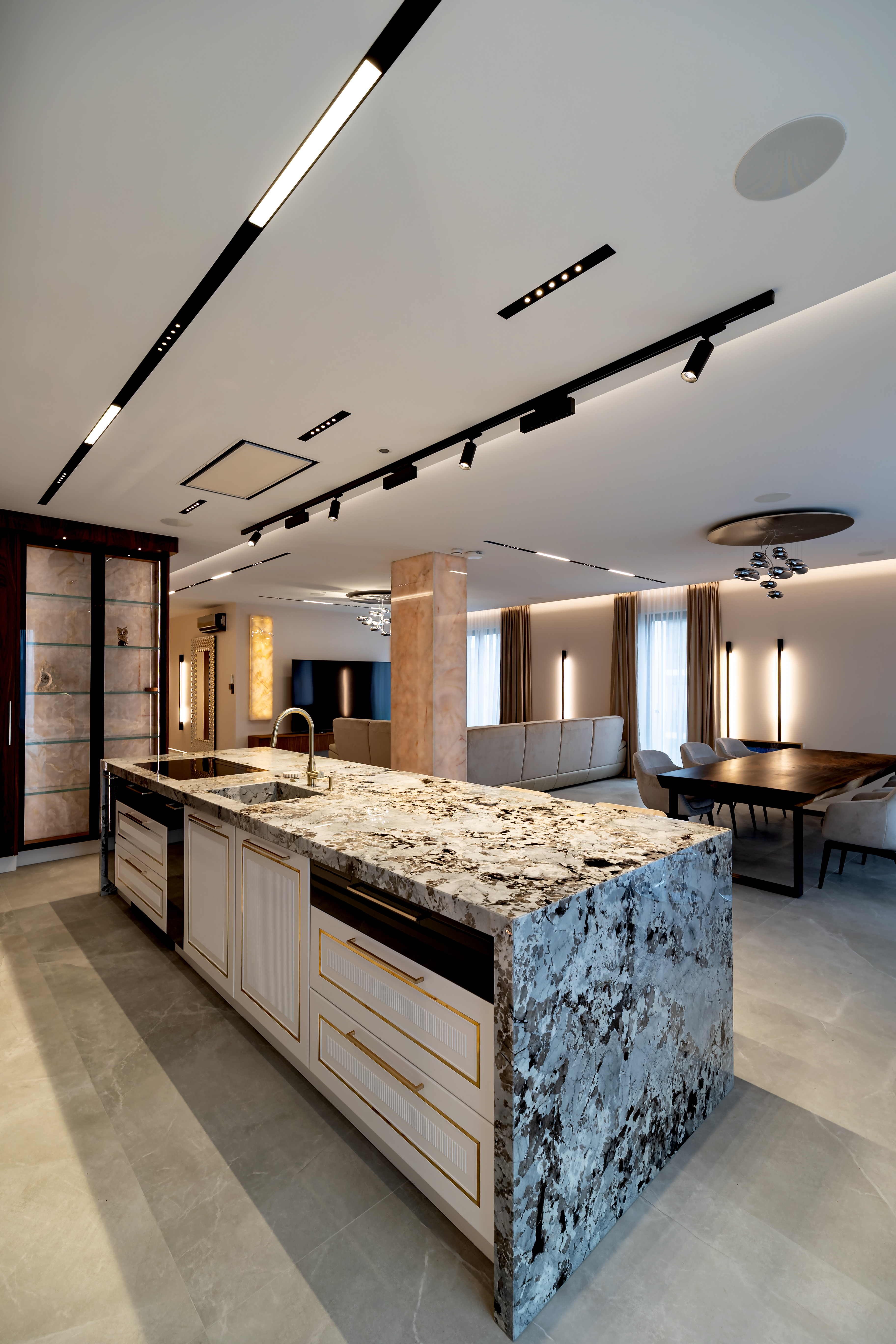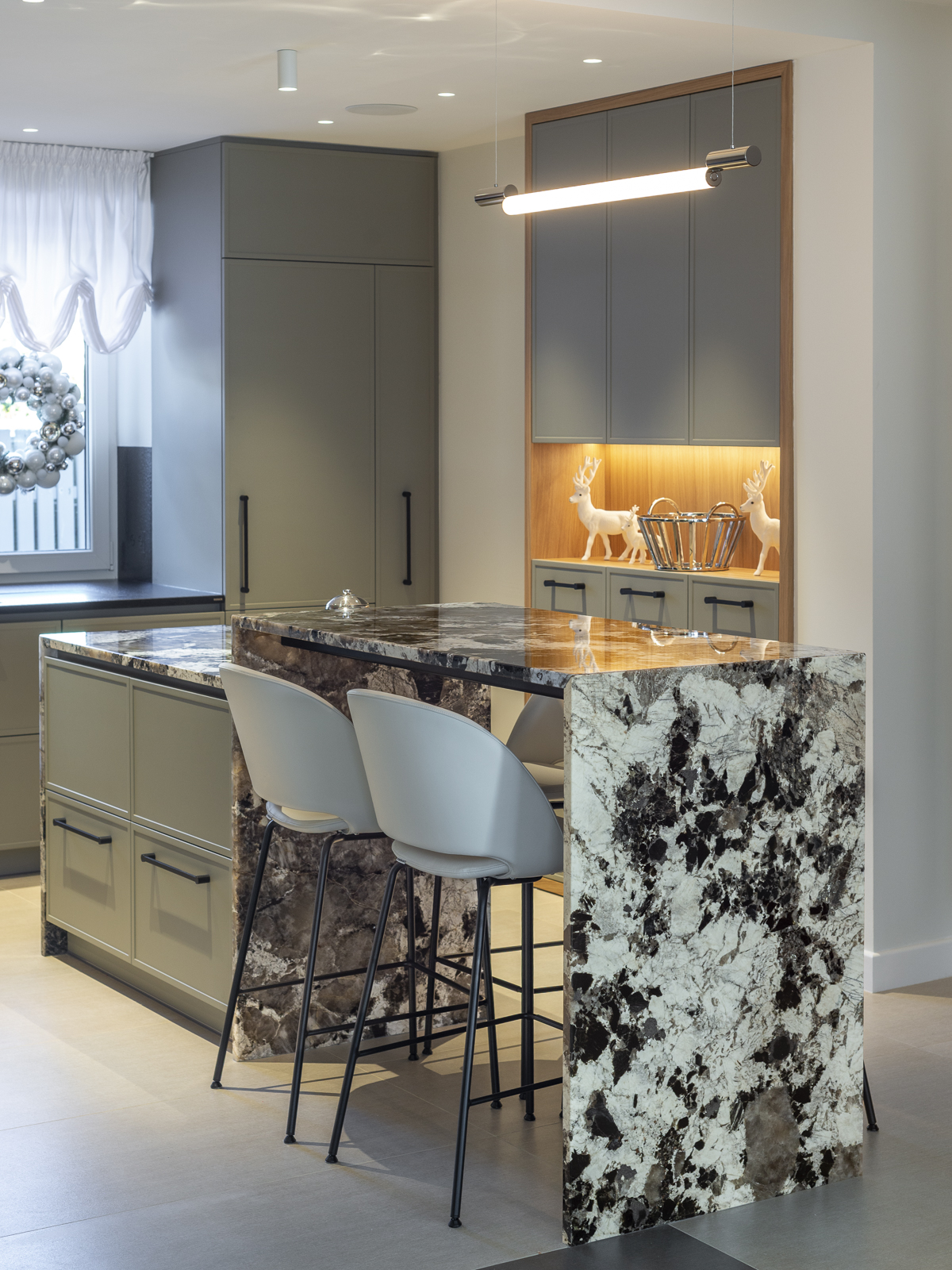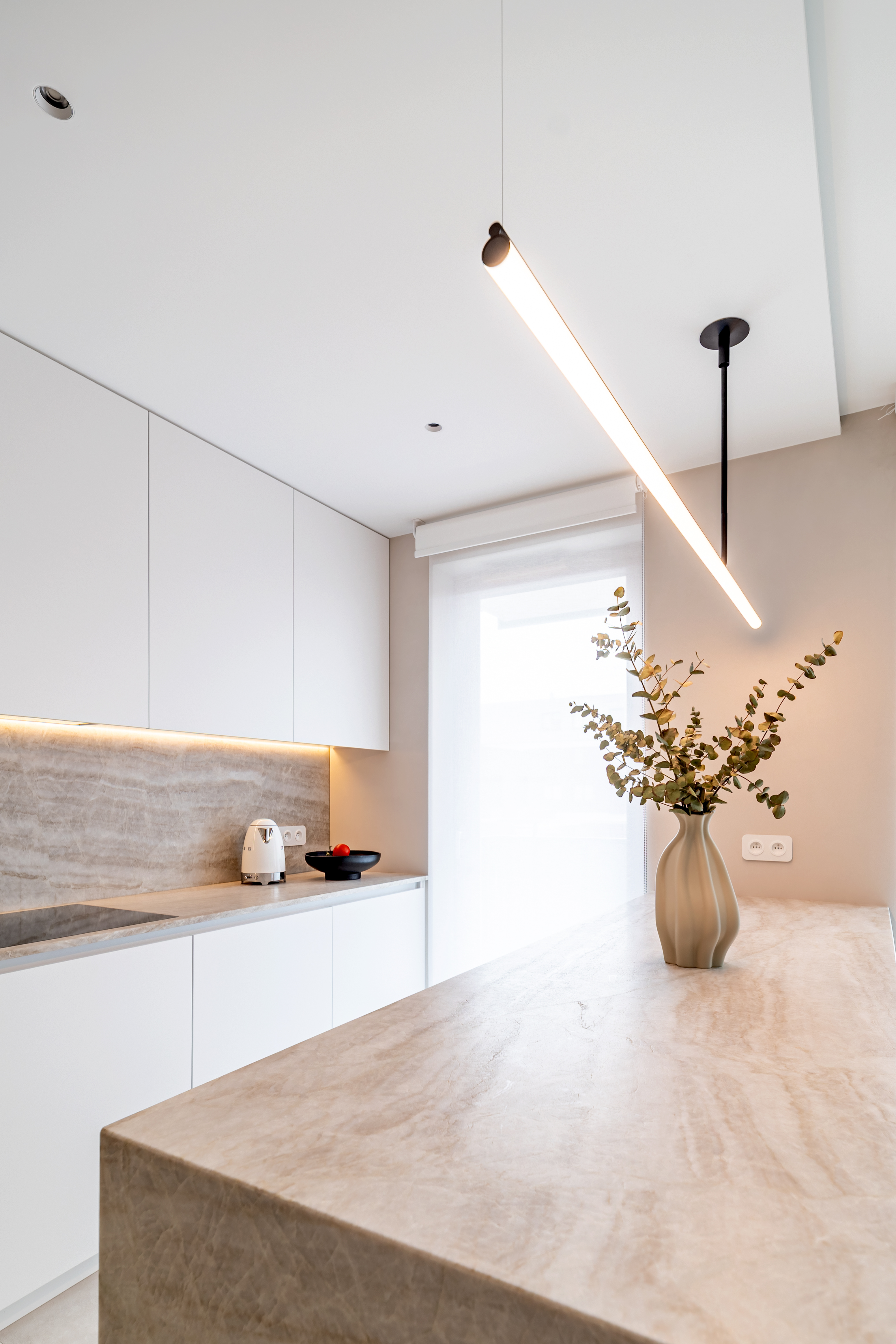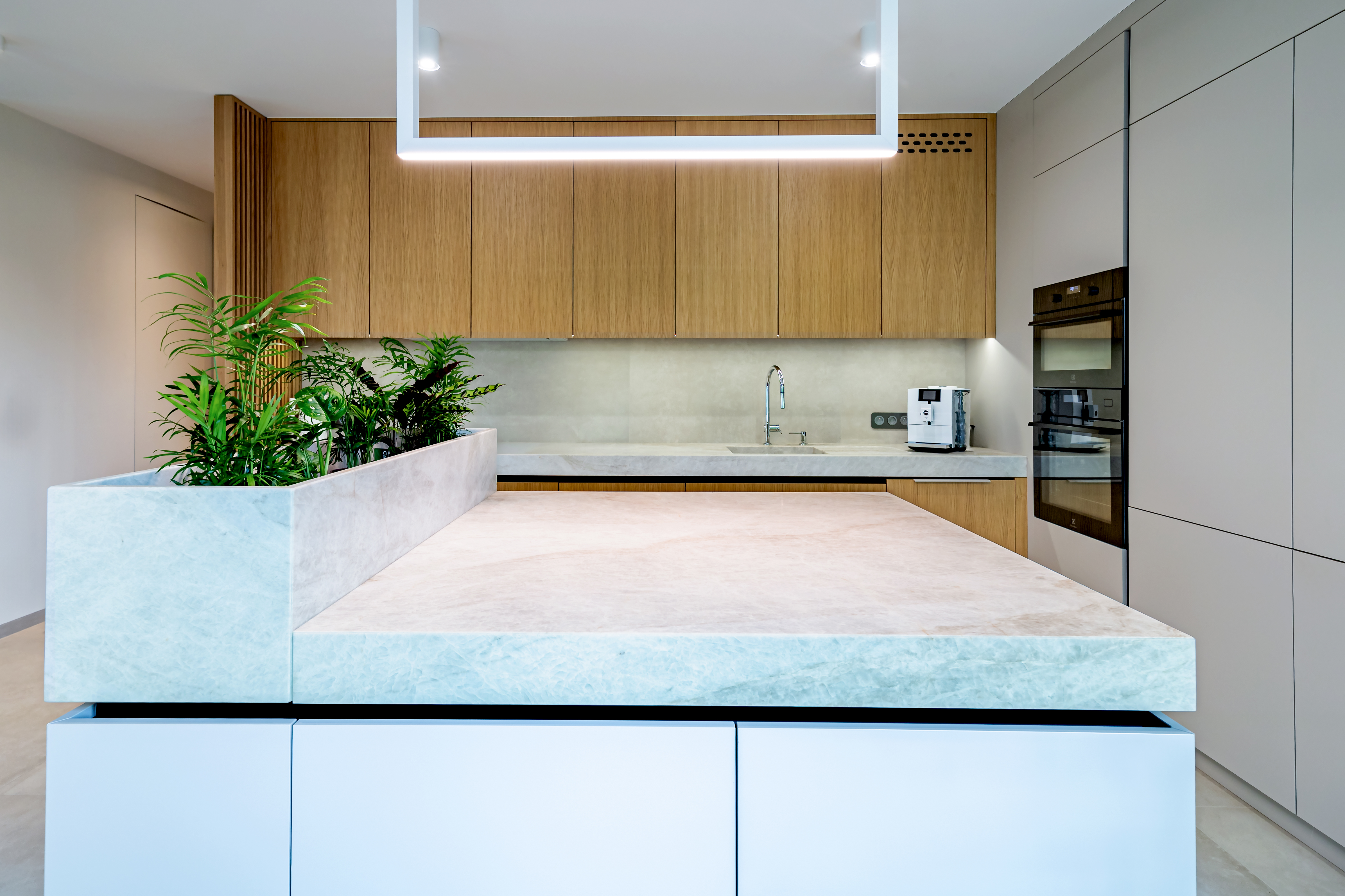 Kwarcyt naturalny 723 Satinato jest połączeniem surowego charakteru kamienia z subtelnym, satynowym wykończeniem. Jego jasna, delikatnie szaro-beżowa kolorystyka z nieregularnym użyleniem nadaje przestrzeniom lekkości, a jednocześnie wprowadza do wnętrz nutkę naturalnego ciepła. To świetna alternatywa dla klientów, którzy szukają jasnego kamienia naturalnego, a jednak nie chcą zdecydować się na kwarcyt biały.