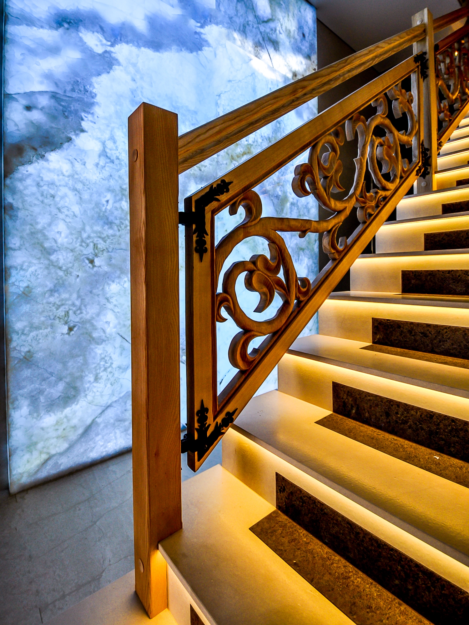 Jeśli chodzi o wnętrze, tutaj mamy nieco szersze pole do popisu. Na kamienne schody w środku polecamy dolomit, kwarcyt naturalny i marmur. Ten ostatni, zwłaszcza w jasnym odcieniu, najczęściej wykorzystywany jest w projektach z segmentu premium – gładka powierzchnia, często łączona z dużymi kolumnami i ozdobnymi żłobieniami sprawia, że schody z marmuru są dekoracją samą w sobie.