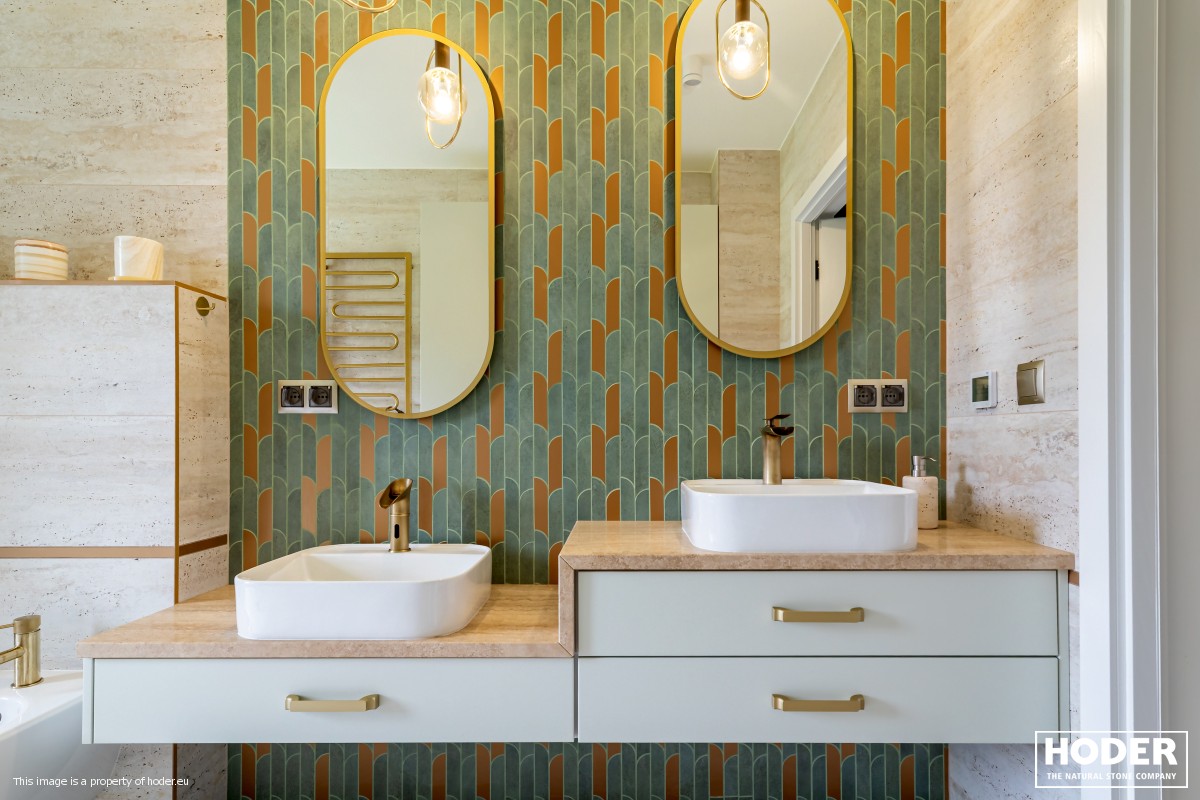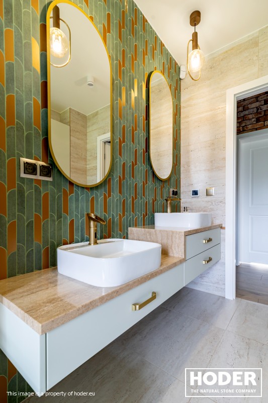 Łazienka z Trawertynu 125 i konglomeratu kwarcowego 300 oraz kuchnia, łazienka z Granitu 480 i 37