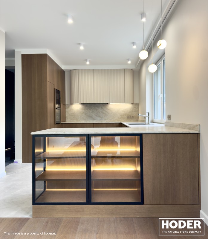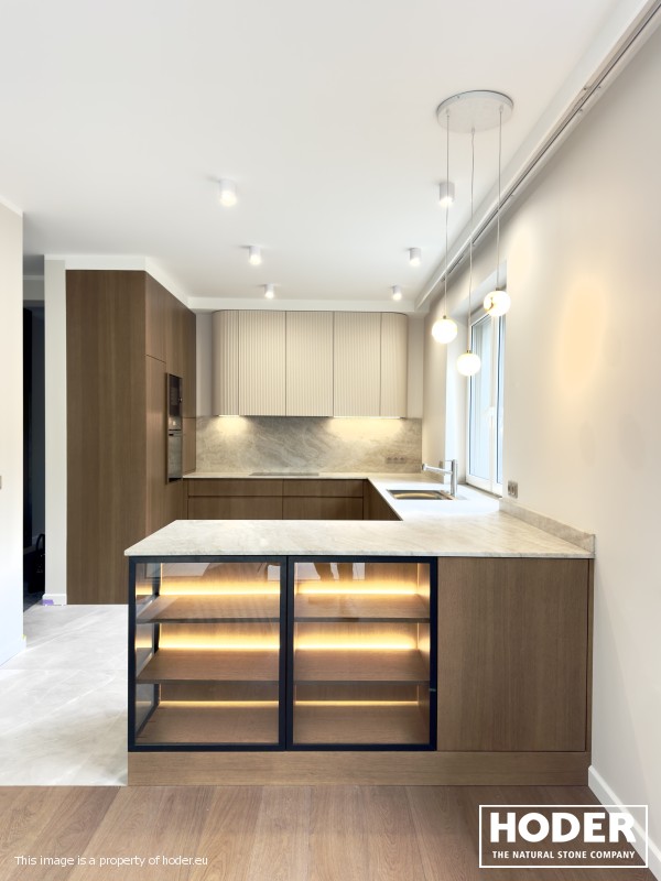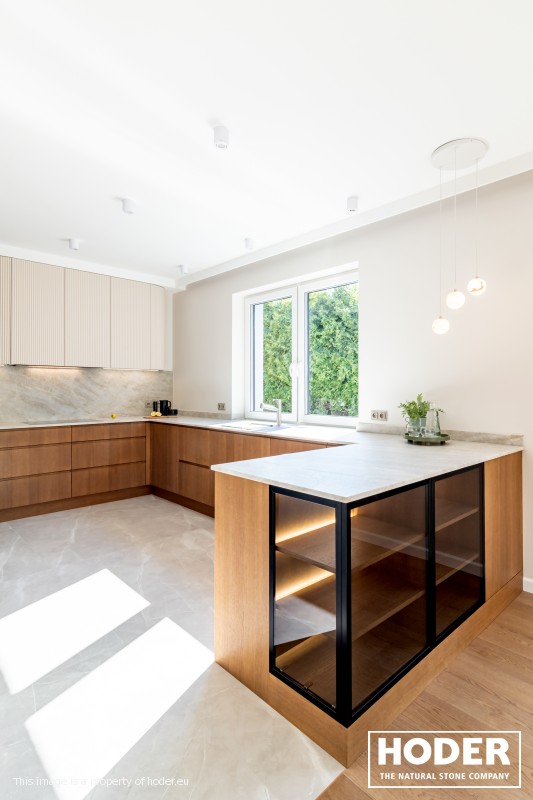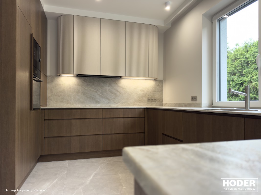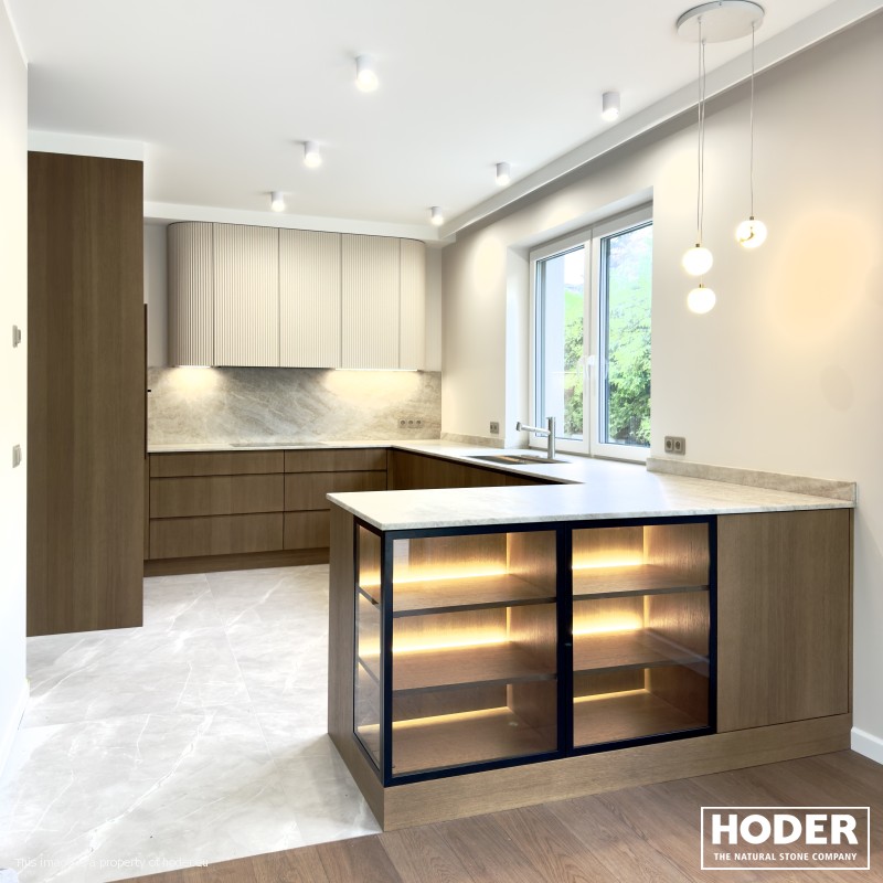 Kuchnia z kwarcytu naturalnego Satinato 723, łazienka z granitu Satinato 464 oraz parapet z konglomeratu kwarcowego 2005