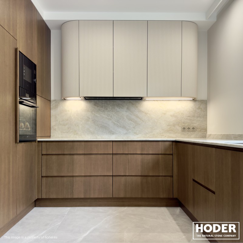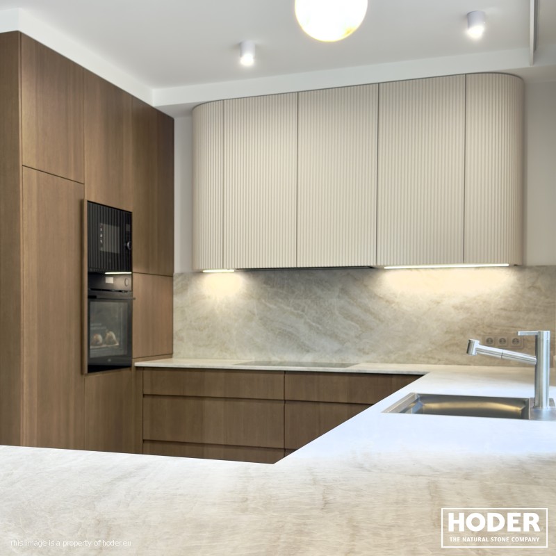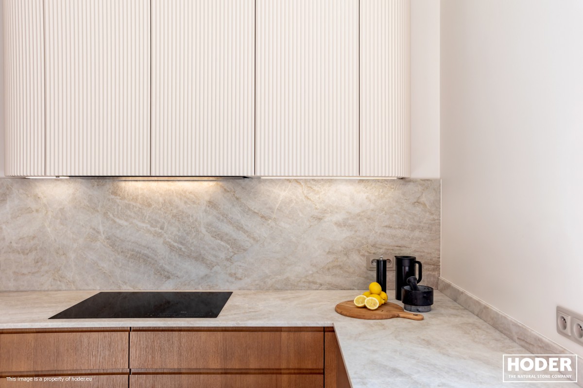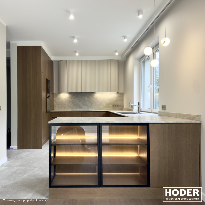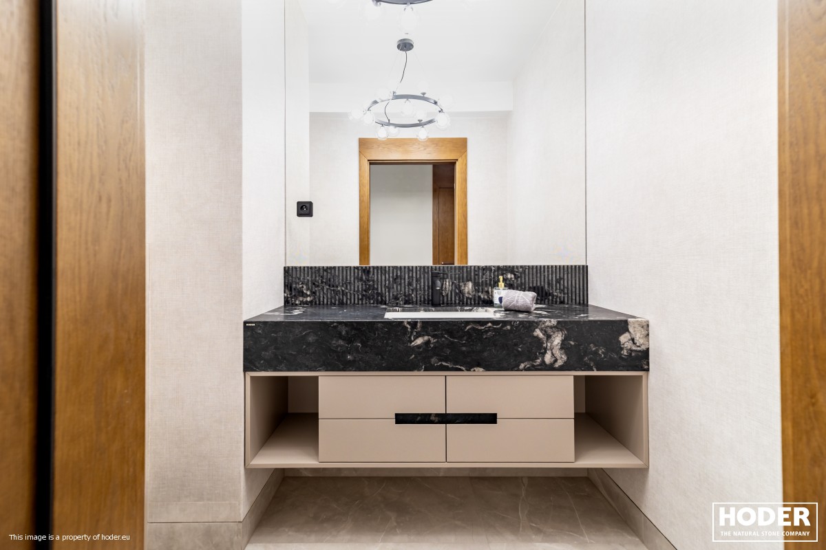 Kuchnia z kwarcytu naturalnego Satinato 723, łazienka z granitu Satinato 464 oraz parapet z konglomeratu kwarcowego 2005
